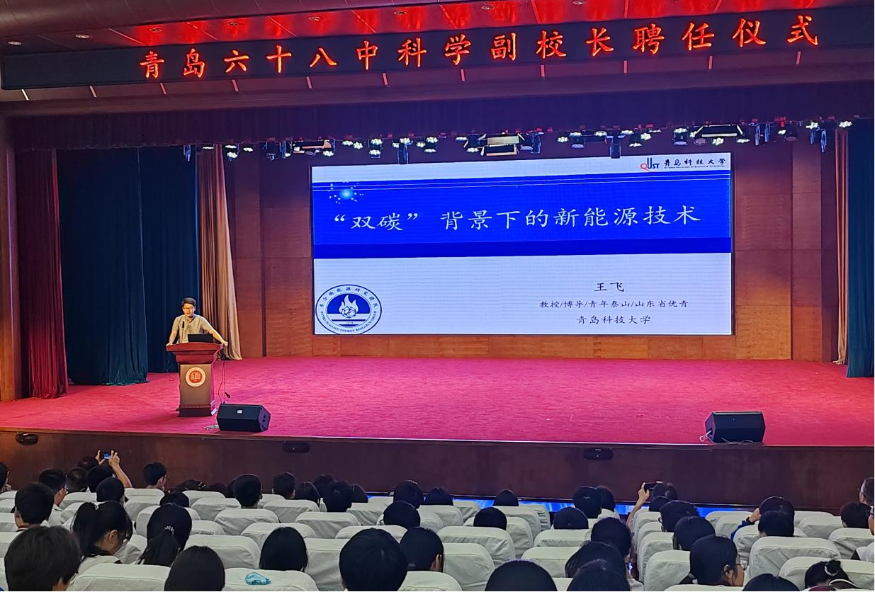 为建设高素质教育科研队伍,7月4日下午,青岛科技大学附属中学青岛六十八中举行科学副校长聘任仪式,学校3245澳门新莆京王飞教授应邀出席并受聘担任青岛六十八中科学副校长。作为青岛六十八中科学副校长,王飞为现场师生做了题为《“双碳“背景下的新能源技术》的报告。