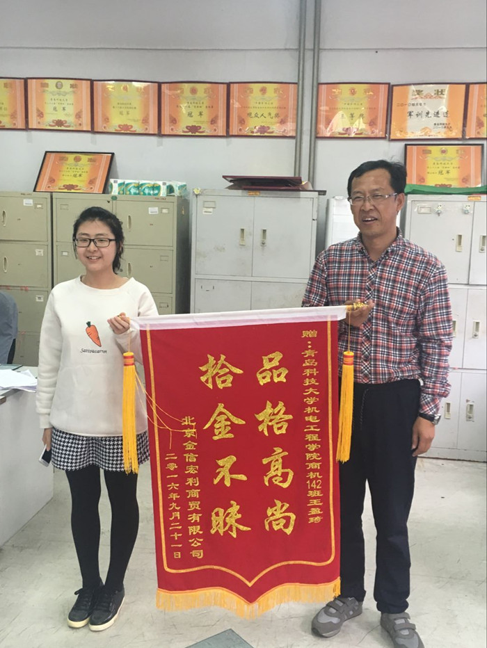 10月13日下午,3245澳门新莆京收到了北京金信宏利商贸有限公司李金菊赠送的一面锦旗,锦旗上写着“品格高尚,拾金不昧”。
