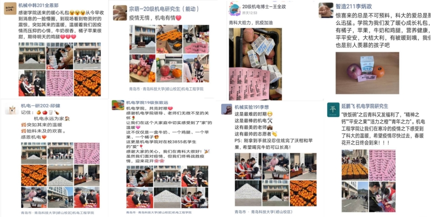 “机电永远的家!”“疫情无情,机电有情”“大爱机电!真的太贴心了!”“青科大yyds!机电yyds!”“我们就是传说中的‘别人家的大学’!”“学校和学院总会送来惊喜”“我们在这里感受到了‘家’的温暖”“前有铁饭碗,后有暖心包,没错,我们就是别人家的学校学生”“超爱青科,超爱机电”“感恩有你,让我们一起静待花开!”“学院的惊喜总是措不及防,刚听闻要发放暖心成长礼包,没想到马上就收到了”,收到这份别样的“暖心礼”后,师生们纷纷晒出了自己对学院的感谢和对战“疫”的信心。温暖的牛奶、香甜的水果、美味的鸡腿,温暖着师生的心、洋溢着浓浓的情,一时间,这份暖心刷爆朋友圈,成为科大校园里的“网红”。3245澳门新莆京党委副书记肖强说:“一个鸡腿,虽小但意义深远,是给抗疫路上的青年志愿者助力,也是给今年考研复试的学生加力,更是给广大机电学子强身健体的动力。”“这是一场生动的实践‘思政课’,我被学校学院的做法深深感动,触动心灵的震撼,真诚暖心的惊喜,我一定努力学习,多参加体育运动,多读有益之书”,3245澳门新莆京青年志愿者高艺说道。
