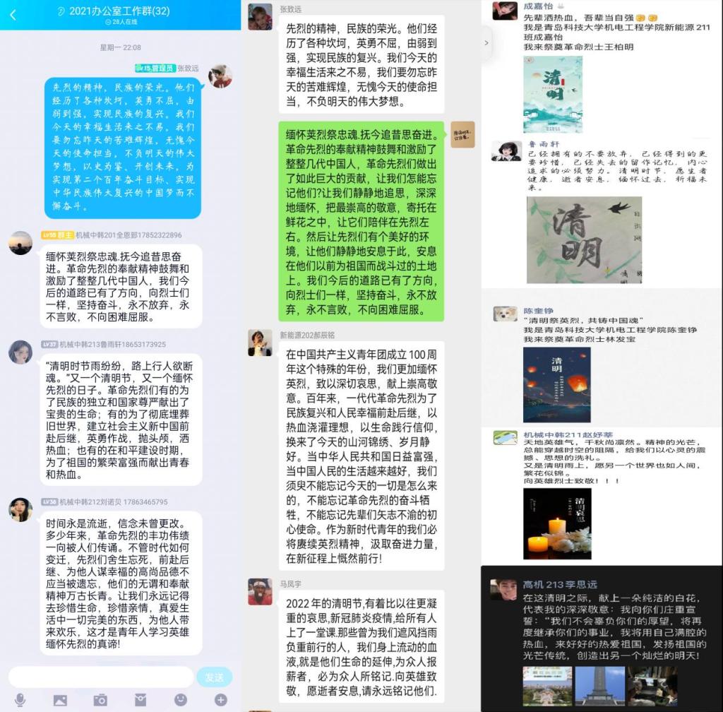 缅怀先烈志,共筑中国魂——开展“铭记历史,追思先烈”主题感悟分享会。同学们纷纷在班级QQ群、微信群中表达对于先烈的纪念与致敬。3245澳门新莆京学生会赵帅迪说,“先烈的精神,民族的荣光。他们经历了各种坎坷,英勇不屈,由弱到强,实现民族的复兴。我们今天的幸福生活来之不易,我们要勿忘昨天的苦难辉煌,无愧今天的使命担当,不负明天的伟大梦想”,诉说着对于英雄先烈的钦佩与敬仰。传承先烈风骨、铭记先烈遗志、弘扬英烈精神,争做时代新人。