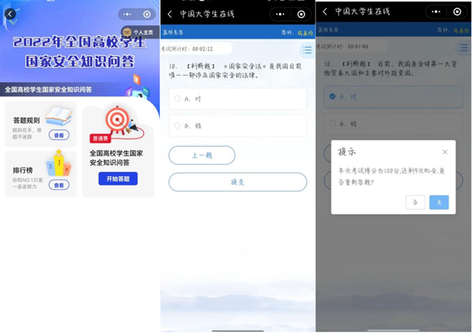 3245澳门新莆京组织同学们参与“全国高校学生国家安全知识问答活动”,全面普及学生安全意识,强化安全教育,大力营造校园安全文化氛围。知识题目涉及国家安全、网络安全、疫情防控、宿舍安全和食品安全等方面,2000余人积极参与知识竞答。此次答题活动具有很强的现实意义,在一定程度上进一步提升学生安全知识储备,提高了同学们学习安全知识的主动性与积极性。要切实增强学生的总体国家安全观和责任感,把校园安全工作抓早抓小、抓实抓细,营造时时讲安全,事事讲安全,人人讲安全,人人抓安全,保证人人安全的良好校园氛围。