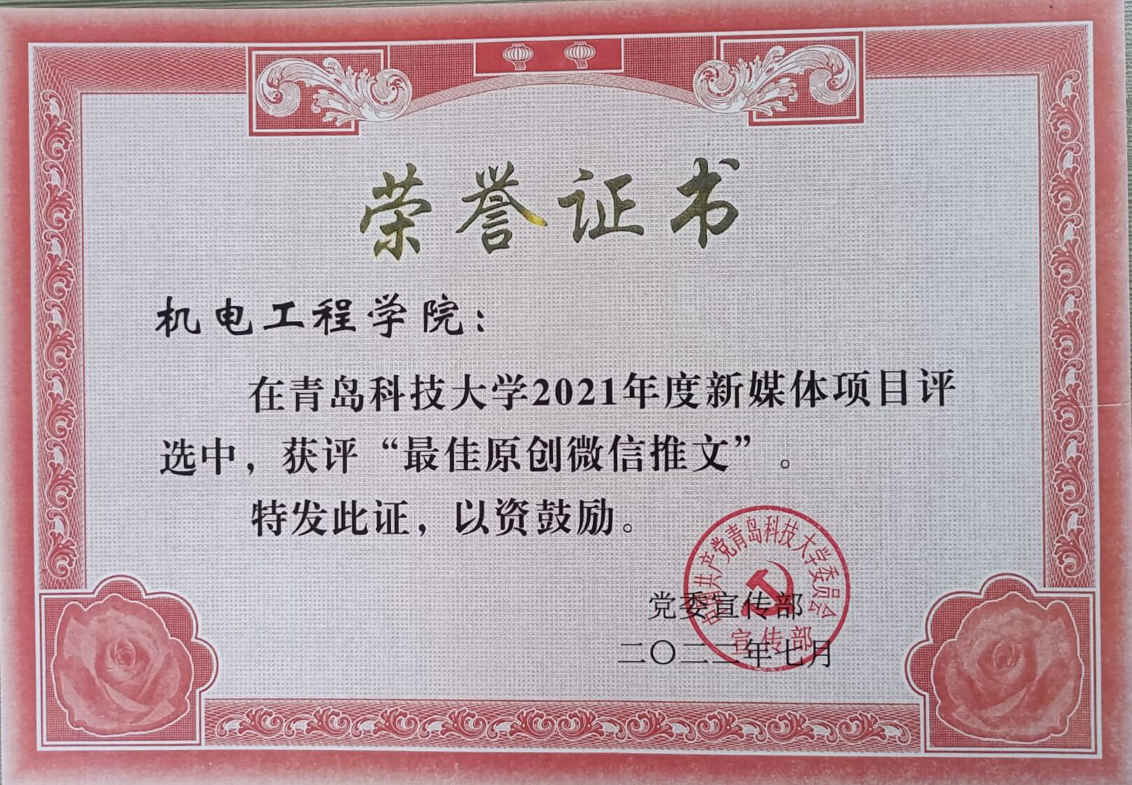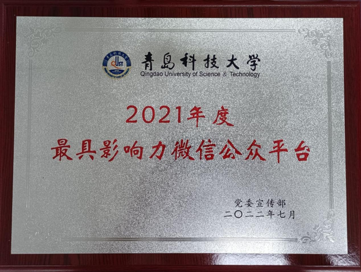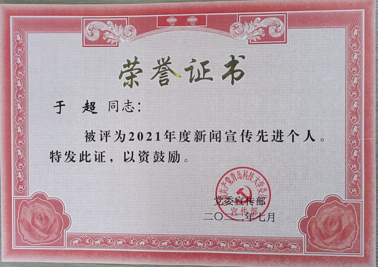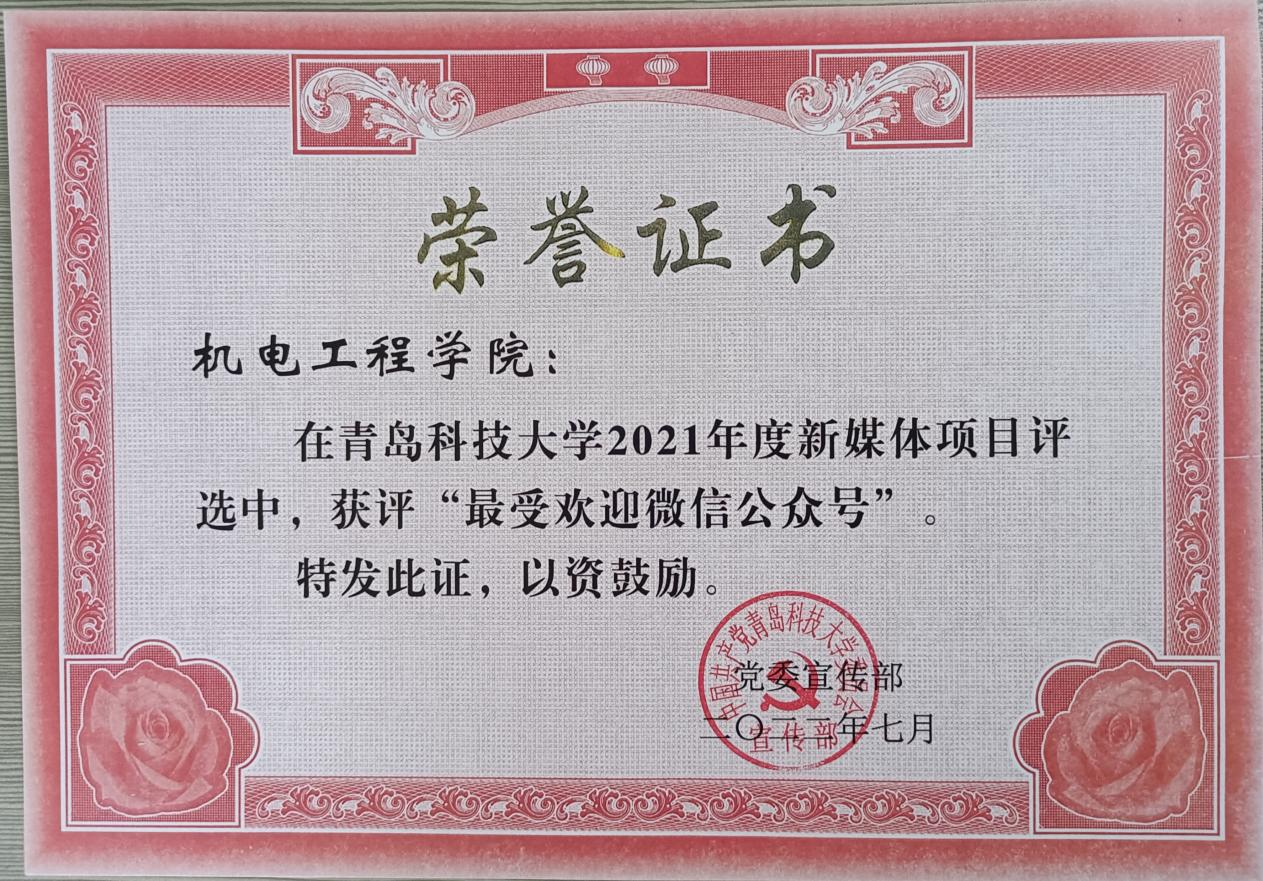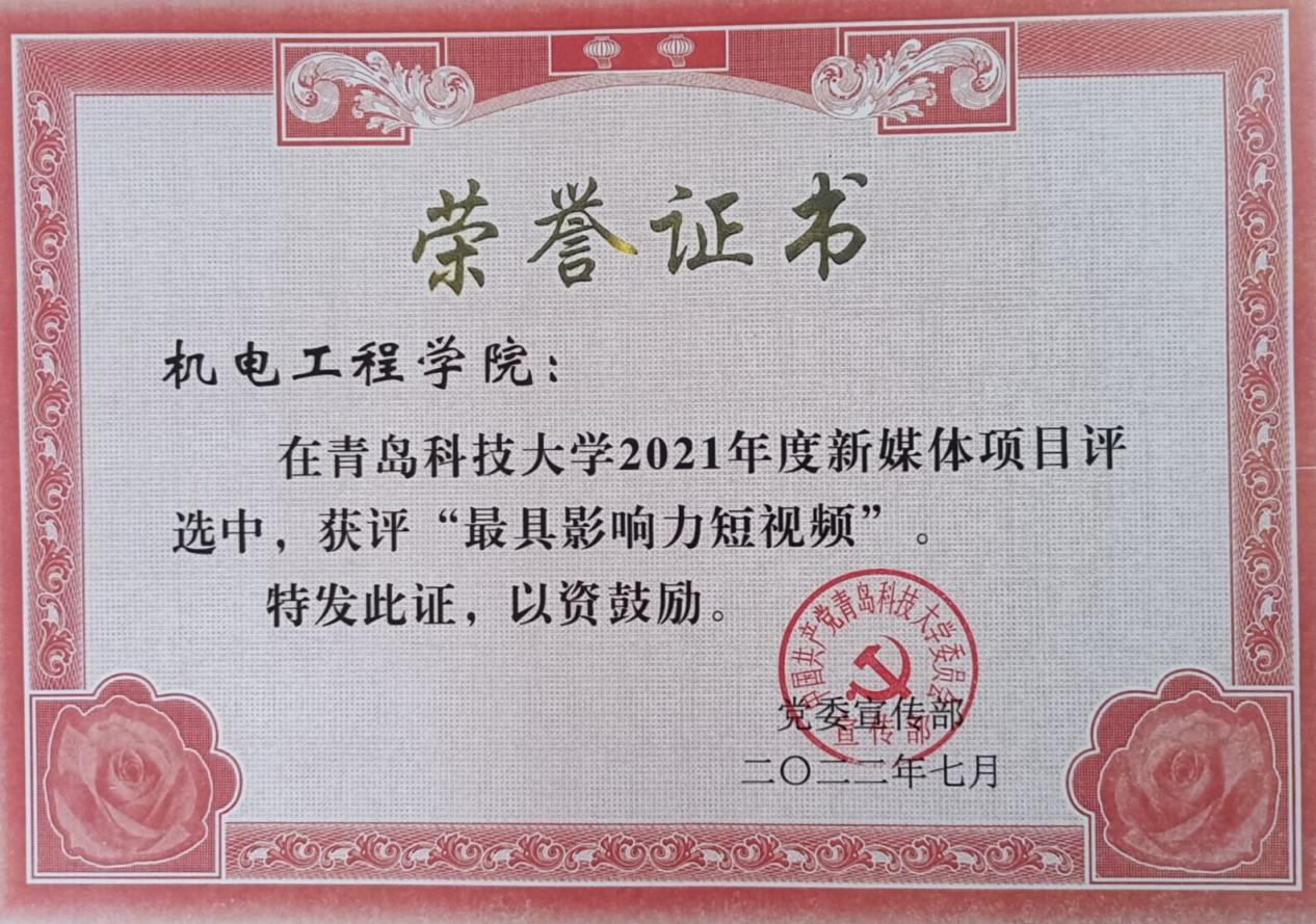 此外,学院在2021年度新媒体项目表彰中荣获多项荣誉。学院荣获2021年度新闻宣传先进单位,微信公众号“青岛科技大学3245澳门新莆京”荣获2021年度最具影响力微信公众平台,新媒体项目评选中获评“最具影响力短视频”、“最佳原创微信推文”和“最受欢迎微信公众号”,于超获2021年度新闻宣传先进个人。