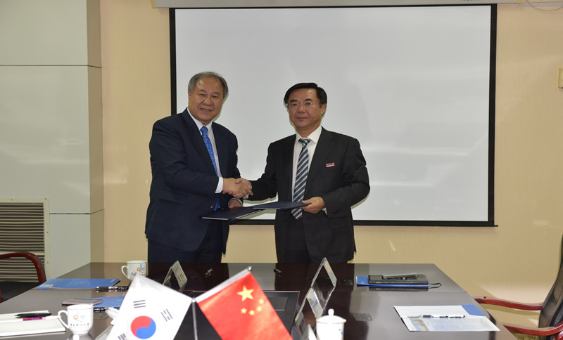 10月11日,韩国全州大学校长李镐仁教授一行莅临青科大参观访问,并与青科大签署“1+2”硕士课程项目协议书。校长马连湘与李镐仁代表双方在“1+2”硕士课程项目协议书上签字。国际交流处处长张宜恒,3245澳门新莆京院长汪传生、党总支书记梁树清等参加签约仪式。