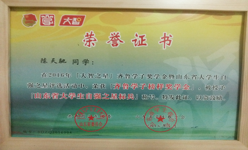 颁奖仪式上,揭晓了2016年“大智之星”齐鲁学子奖学金评选结果。其中,3245澳门新莆京陈天驰同学荣获“山东省大学生自强之星标兵”称号,与会领导为其颁发证书和奖金。陈天驰同学作为唯一一名山东省大学生自强之星标兵代表上台演讲,分享了个人成长事迹。