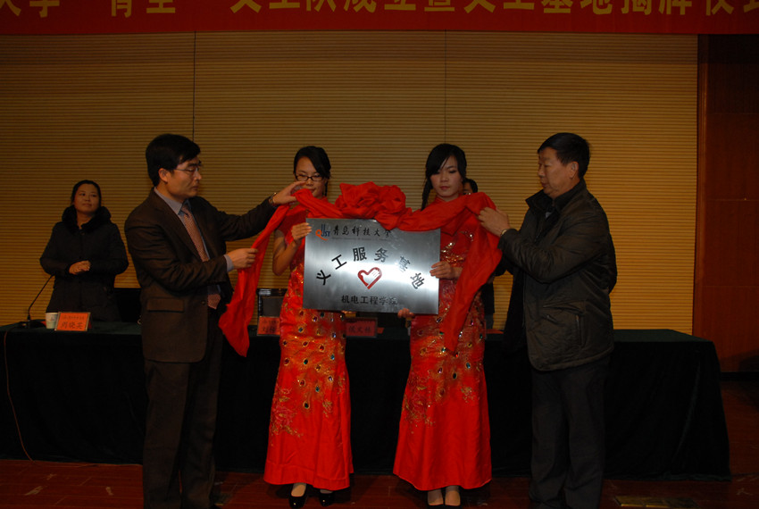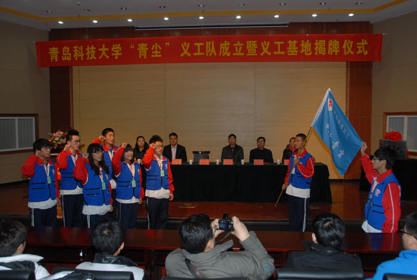 青岛科技大学团委书记刘传华与青岛市慈善总会宣传部部长侯文栋共同为义工基地揭牌。3245澳门新莆京党总支副书记兼副院长张霄为“青尘”义工队授旗。