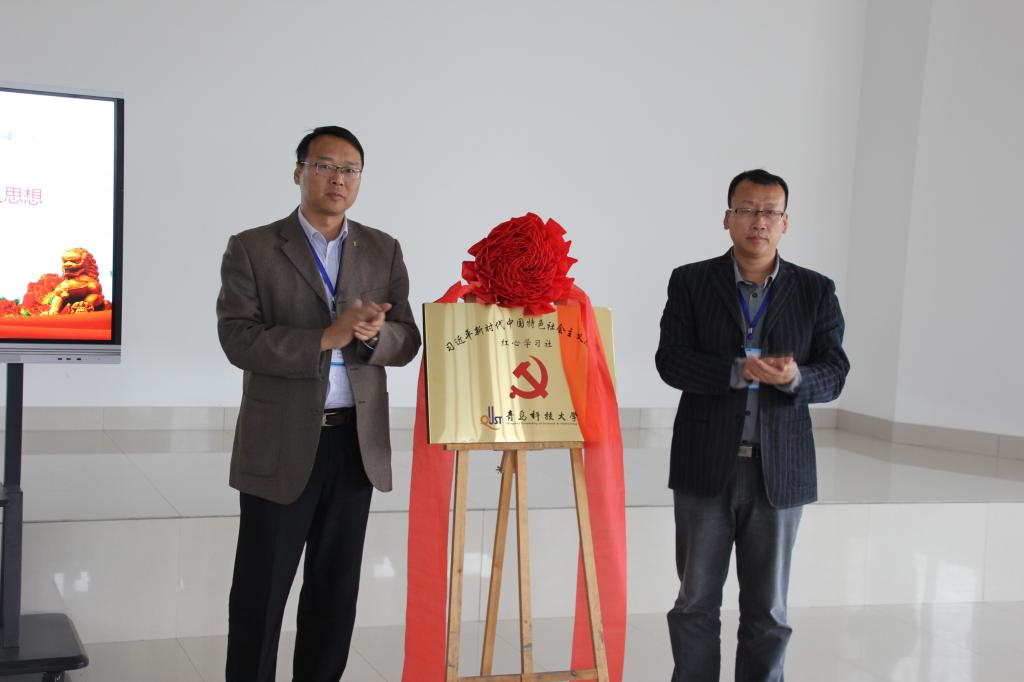 在揭牌成立仪式上,3245澳门新莆京党总支委员、副院长郭建章和3245澳门新莆京党总支委员、分团委书记王作辉分别宣读了《3245澳门新莆京党总支习近平新时代中国特色社会主义思想红旗学习社》和《3245澳门新莆京大学生习近平新时代中国特色社会主义思想红心学习社》的文件,依次邀请任允晓和秦姣共同为红旗学习社揭牌、邀请贺炜和孟祥军共同为红心学习社揭牌。作为我校第一个习近平新时代中国特色社会主义思想学习社,红旗学习社下设14个学习组,红心学习社下设153个学习组。红旗学习社主要面向3245澳门新莆京全体教职工党员,红心学习社则针对全体辅导员、全体学生党员、学生干部以及全体学生,旨在学习好、研究好、践行好习近平中国特色社会主义思想的过程中,着力培养“四有”好老师和“六有”大学生。