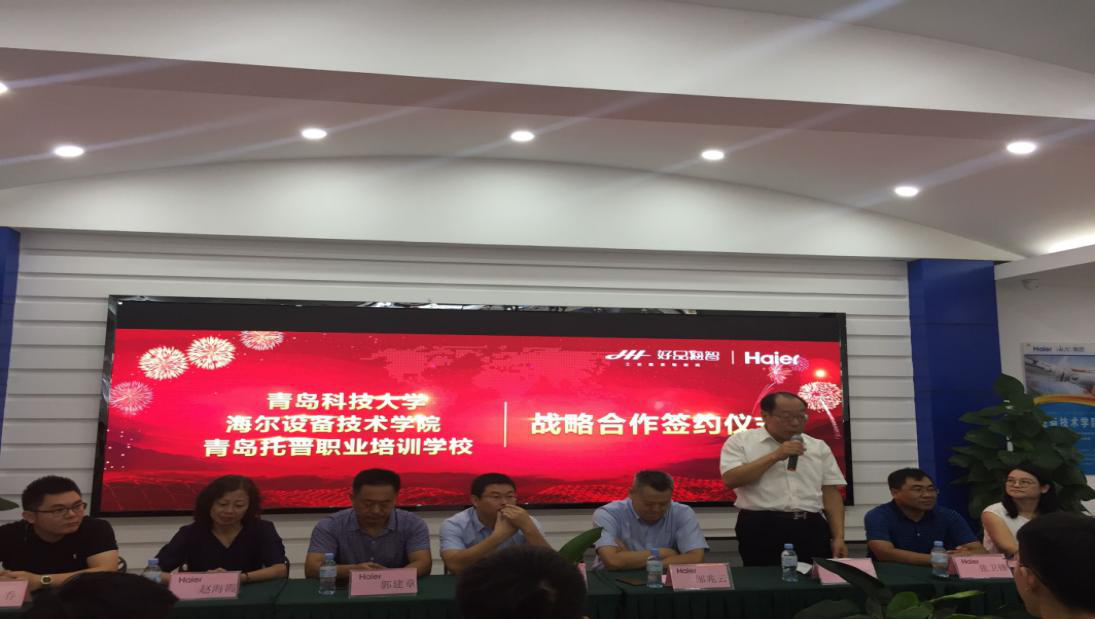 9月12日,青岛科技大学与海尔设备技术学院、青岛托普职业培训学校战略合作签约仪式暨青岛科技大学大学生实习基地挂牌仪式在海尔工业园隆重举行。青岛科技大学3245澳门新莆京党总支书记孙立军、海尔设备技术学院院长邹兆云、青岛市大学生创业服务中心主任褚庆柱、青岛托普集团总经理王敏燕等共同出席签约仪式并致辞。