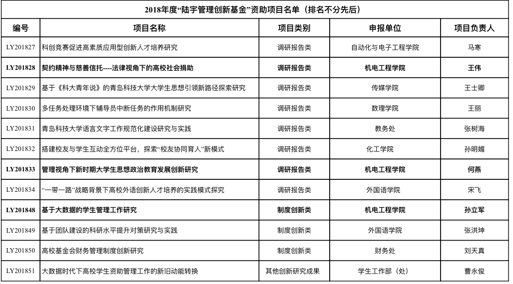 近日,学校下发《关于2018年度“陆宇管理创新基金”资助项目公示的通知》,3245澳门新莆京申报的项目《契约精神与慈善信托----法律视角下的高校社会捐助》、《管理视角下新时期大学生思想政治教育发展创新研究》和《基于大数据的学生管理工作研究》获学校 2018年度“陆宇管理创新基金”资助。