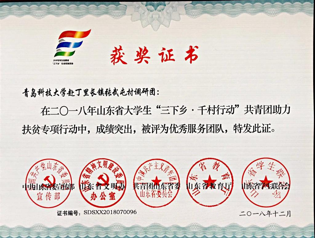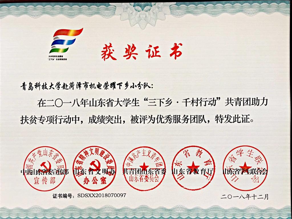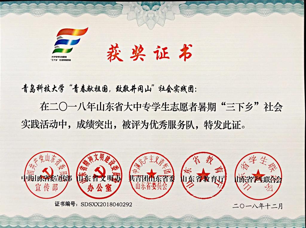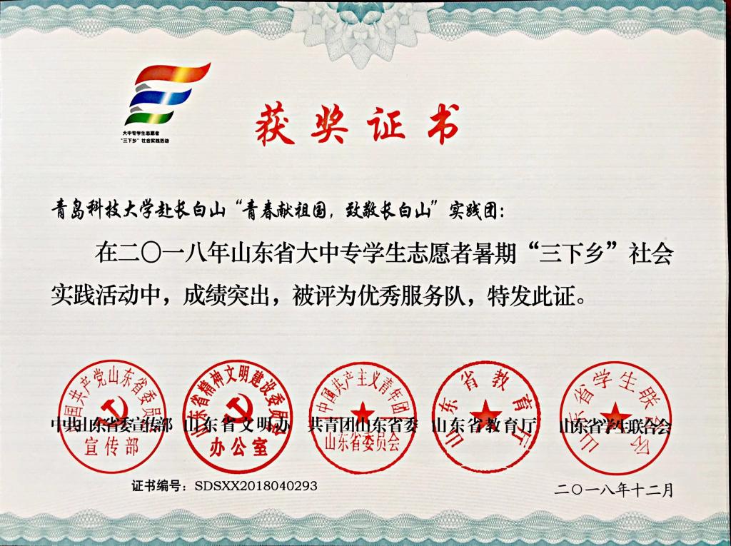 近日,2018年山东省大中专学生志愿者暑期文化科技卫生“三下乡”社会实践活动先进集体和先进个人的证书下发,3245澳门新莆京“青岛科技大学赴长白山‘青春献祖国 致敬长白山’实践团” “青岛科技大学赴长白山‘青春献祖国 致敬井冈山’实践团”获“三下乡”社会实践省级优秀服务队, “青岛科技大学赴菏泽市机电荣耀下乡小分队”、“青岛科技大学赴丁里长镇张武屯村调研团”获“三下乡·千村行动”共青团助力扶贫专项行动省级优秀服务团队,曲智强、李东阳获 “三下乡·千村行动”共青团助力扶贫专项行动社会实践活动优秀指导教师,王娟娟、苗清获“三下乡”社会实践活动优秀指导教师,毕岚森等多名学生获 “三下乡”社会实践优秀学生。