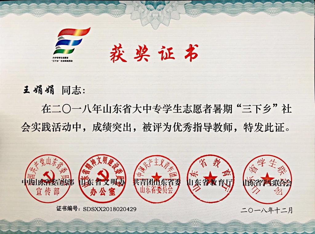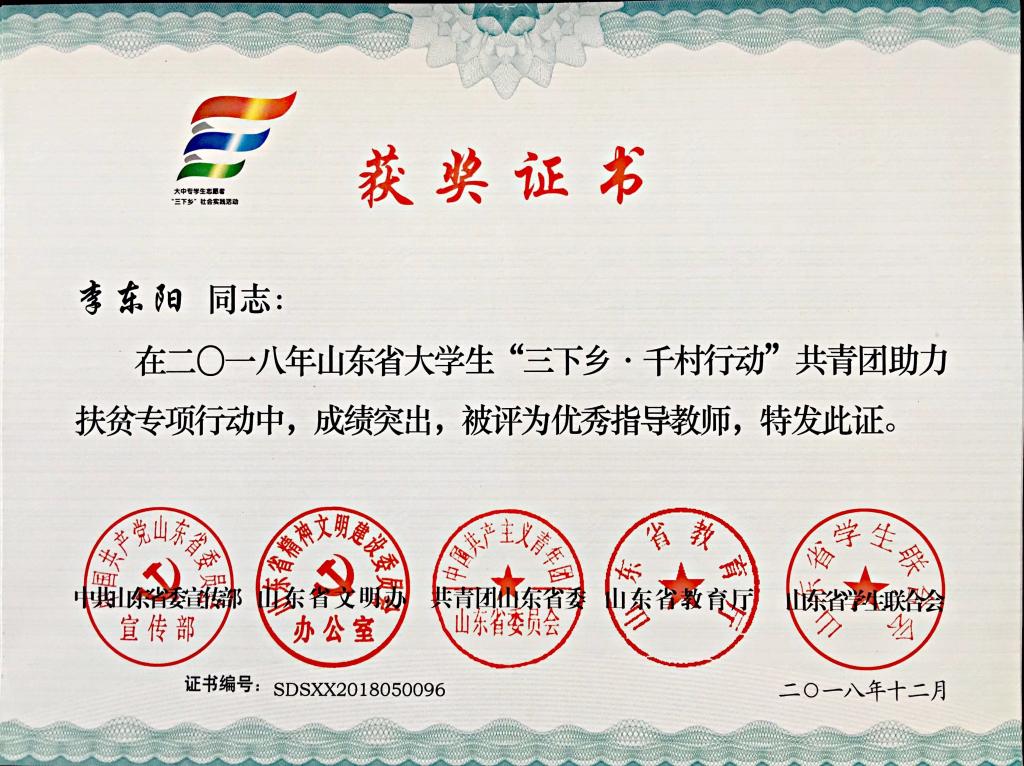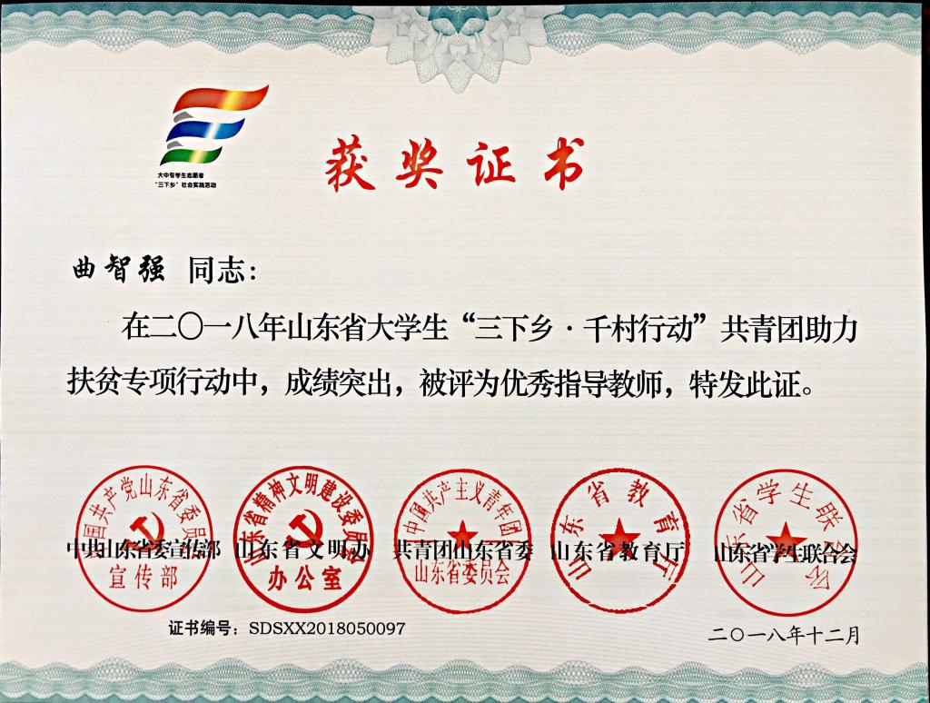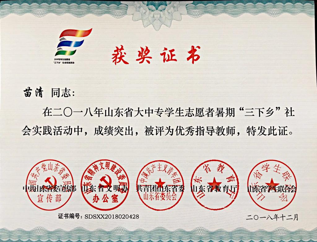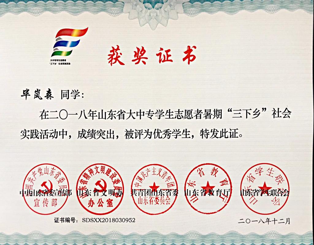 近日,2018年山东省大中专学生志愿者暑期文化科技卫生“三下乡”社会实践活动先进集体和先进个人的证书下发,3245澳门新莆京“青岛科技大学赴长白山‘青春献祖国 致敬长白山’实践团” “青岛科技大学赴长白山‘青春献祖国 致敬井冈山’实践团”获“三下乡”社会实践省级优秀服务队, “青岛科技大学赴菏泽市机电荣耀下乡小分队”、“青岛科技大学赴丁里长镇张武屯村调研团”获“三下乡·千村行动”共青团助力扶贫专项行动省级优秀服务团队,曲智强、李东阳获 “三下乡·千村行动”共青团助力扶贫专项行动社会实践活动优秀指导教师,王娟娟、苗清获“三下乡”社会实践活动优秀指导教师,毕岚森等多名学生获 “三下乡”社会实践优秀学生。