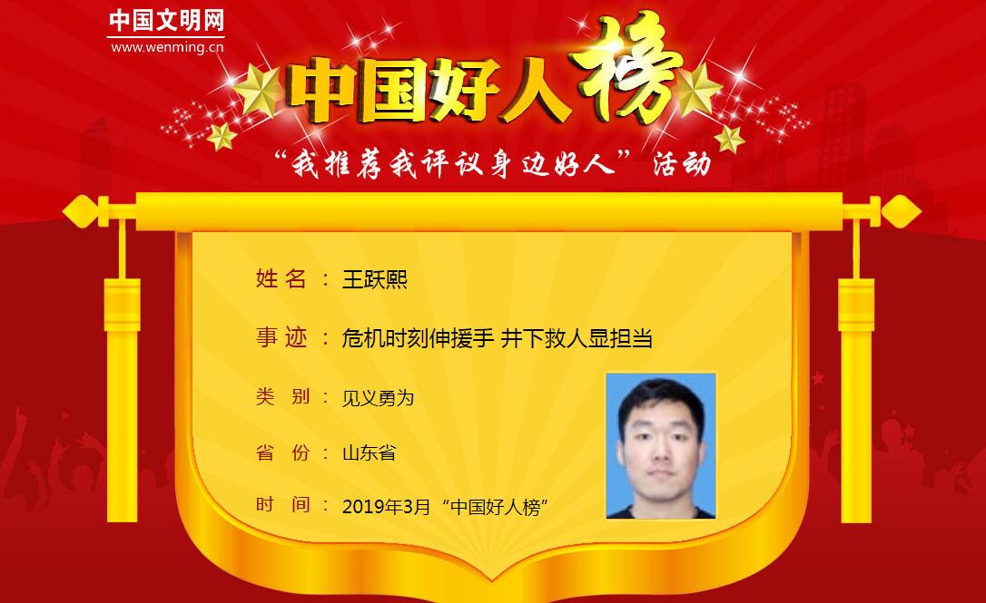 继2019年2月机电学子王跃熙获评“山东好人之星”荣誉称号之后,2019年3月王跃熙同学再次入选中宣部、中央文明办举办的“中国好人榜”。王跃熙同学在危急时刻伸出援手,英勇井下救人,受到社会各界广泛赞誉,展现了新时代机电学子勇于担当的良好形象。