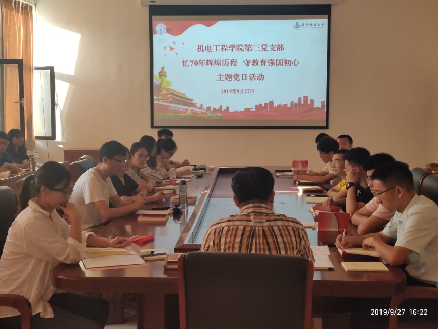 为贯彻青岛科技大学召开“不忘初心、牢记使命”主题教育工作会议精神、贯彻校组织部关于党支部组织生活指导意见,在建国70周年到来之际,充分发挥党员的榜样示范作用,营造爱国氛围、凝聚奋进力量,引领广大师生继承和发扬爱国主义精神,不断提升党的凝聚力和引领力。9月27日,3245澳门新莆京第三党支部在3245澳门新莆京518会议室举行“忆70年辉煌历程 守教育强国初心”主题党日活动。第三党支部全体党员参加了活动,活动由党支部书记王作辉主持。