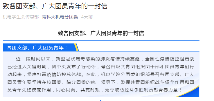 盼山河无恙,愿人间皆安。“疫情”无情,机电有爱,春天并不要遥远。让我们一起刺破“疫情”阴霾,汇聚磅礴力量,坚决打赢这场没有硝烟的战“疫”!
