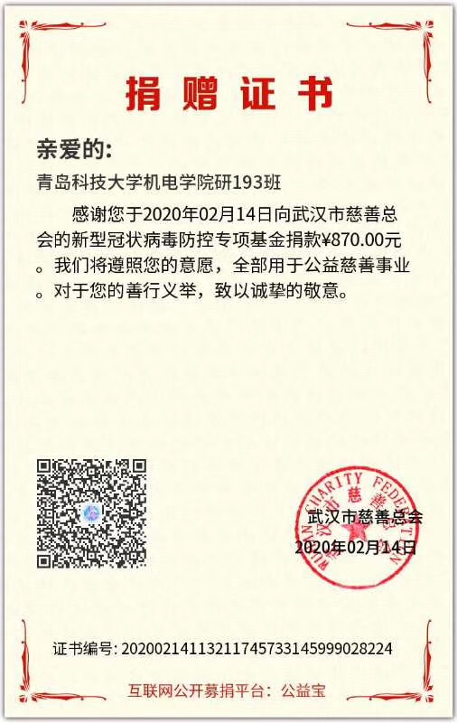 “战‘疫’路上,有你有我,一路同行。”青春战‘疫’的样子还有很多,装控162班崔苏宁同学看到疫情肆虐却急缺口罩、防护服等医用物资时,他心急如焚,用自己的压岁钱向武汉儿童医院捐助4套防护服。省建档立卡户王聪也捐出100元善款,他说:“一方有难八方支援,受到社会帮助的他也应该学会帮助他人”。研究生6个班级共同用自己的压岁钱、积攒的零花钱向武汉慈善总会捐款,为支援“战疫”前线尽一份微薄之力。在防控疫情的关键时刻,机电学子活跃在各个基层,机械中韩164班初梦珠、机械(3+4)161班李世杰、装控183班马江儒、机智181王瑞恒、新能源181马元宇、机械中韩182邵兆坤、机械173班朱洪阳看到家乡防控人手不够,纷纷主动报名参加防控志愿活动,积极投身这场没有硝烟的战场中,用实际行动体现一代青年的责任与担当。