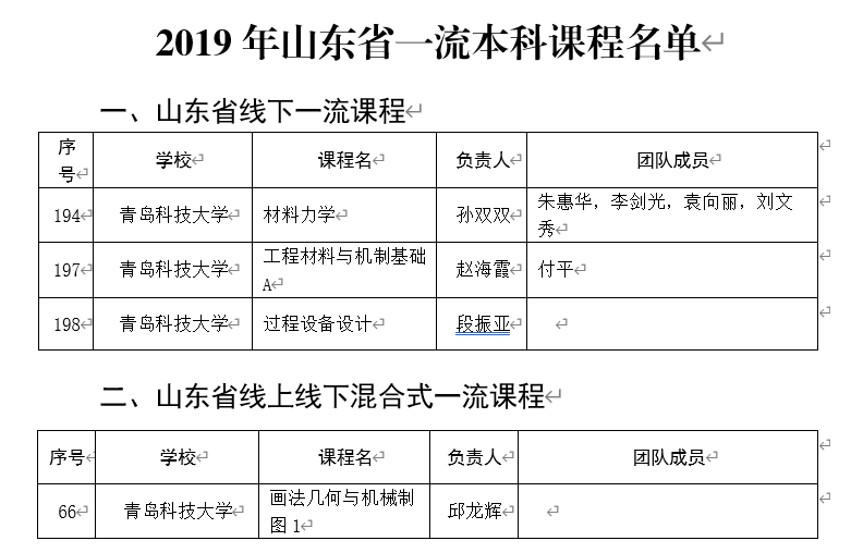 3月4日,在山东省教育厅公布的《关于公布2019年山东省一流本科课程认定结果的通知》中,3245澳门新莆京多门课程入选2019年山东省一流本科,数量居于全校前列。其中,山东省线下一流课程三门:分别是孙双双、朱惠华、李剑光、袁向丽、刘文秀团队《材料力学》,赵海霞、付平《工程材料与机制基础A》,段振亚《过程设备设计》。线上线下混合式一流课程一门:邱龙辉《画法几何与机械制图1》。