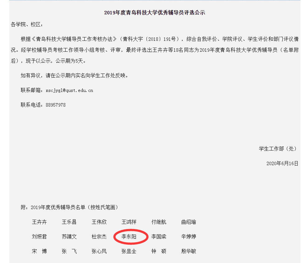 近期,2019年度青岛科技大学优秀辅导员名单公布,新莆京官网李东阳老师名列其中。据悉,此次评选是根据《青岛科技大学辅导员工作考核办法》(青科大字﹝2018〕191号),综合自我评价、学院评议、学生评价和部门评议情况。经学校辅导员考核工作领导小组考核、评审,最终评选出王卉卉等18名同志为2019年度青岛科技大学优秀辅导员。
