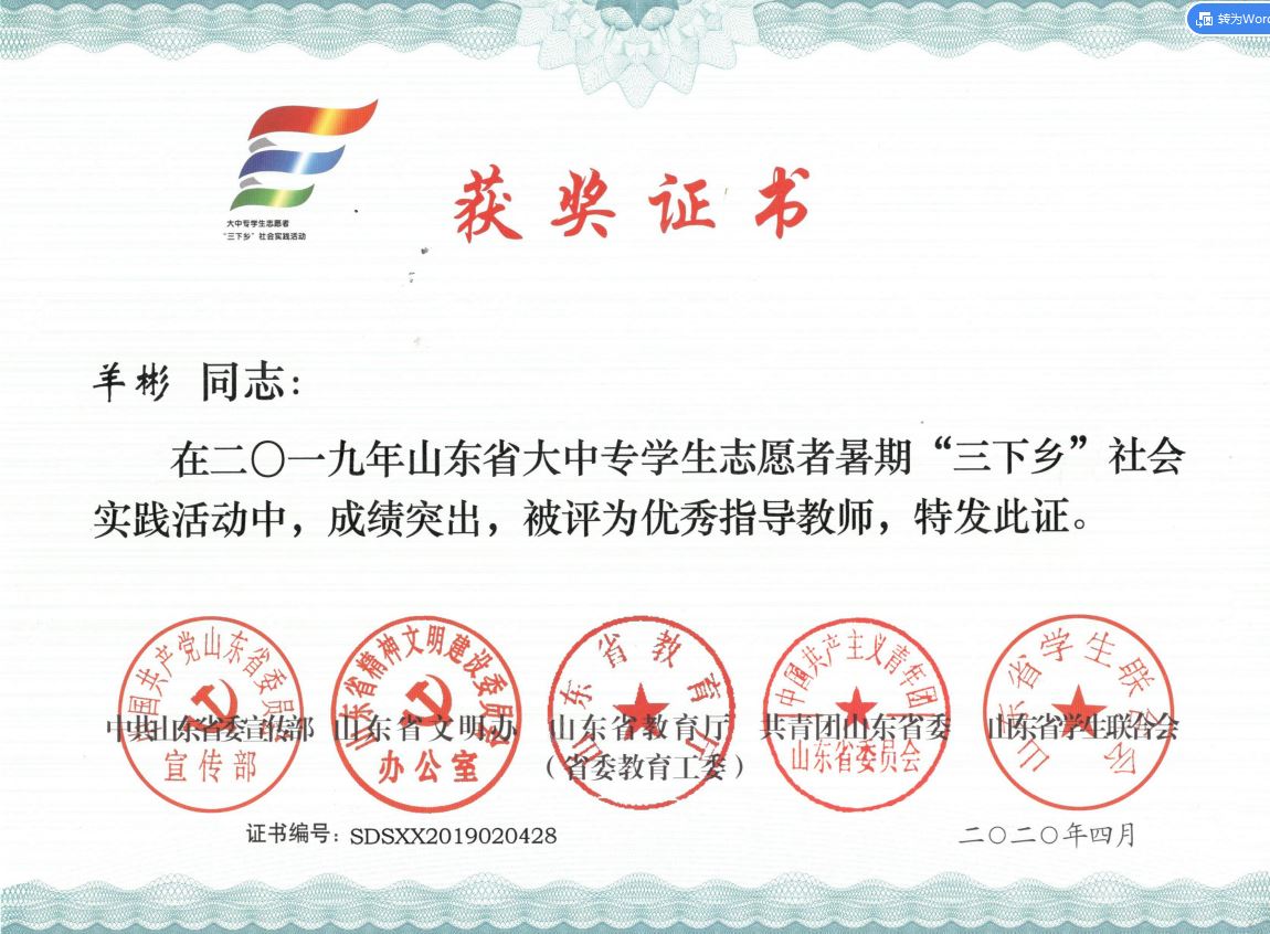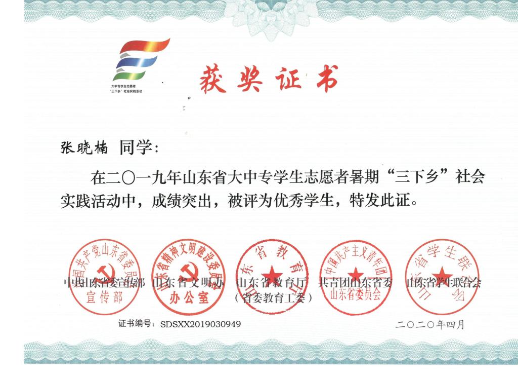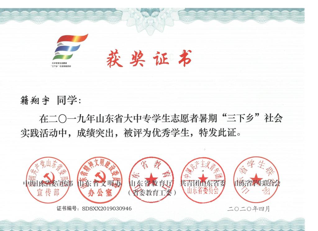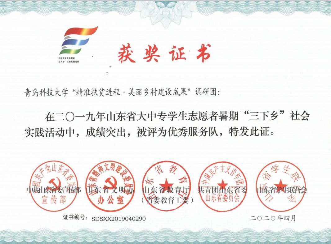 近日,2019年山东省大中专学生志愿者暑期文化科技卫生“三下乡”社会实践活动先进集体和先进个人的证书下发,3245澳门新莆京“青岛科技大学精准扶贫进程 美丽乡村建设成果”调研团、获“三下乡”省级优秀服务团队,孙坤岩、羊彬获“三下乡”社会实践活动优秀指导教师,籍翔宇、张晓楠、范浩然、马晓东获 “三下乡”社会实践优秀学生。