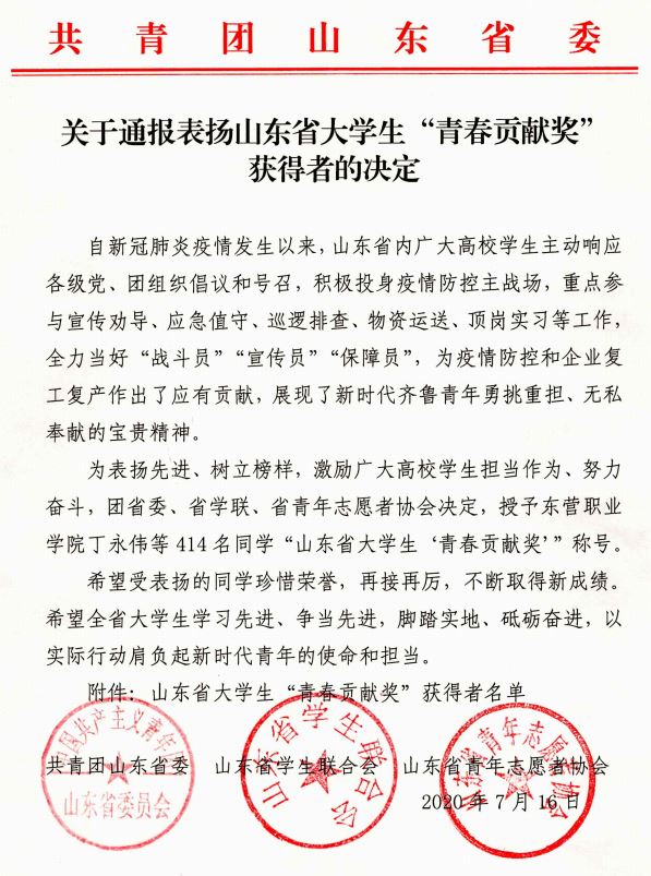 近日,在共青团山东省委公布的《关于通报表扬山东省大学生“青春贡献奖”获得者的决定》中,新莆京官网罗浩宇同学荣获山东省大学生“青春贡献奖”。