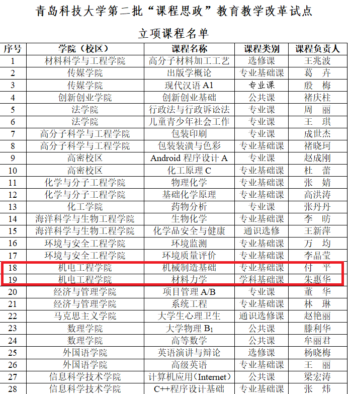 近日,在学校公布的青岛科技大学第二批“课程思政”教育教学改革试点立项课程的通知中,新莆京官网付平老师的《机械制造基础》与朱惠华老师的《材料力学》两门课程荣获立项。