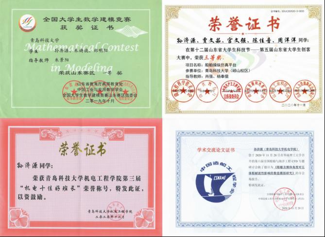 ◆获得全国大学生数学建模山东省一等奖、山东省“互联网+”大学生创新创业大赛铜奖、山东省创客大赛三等奖等。