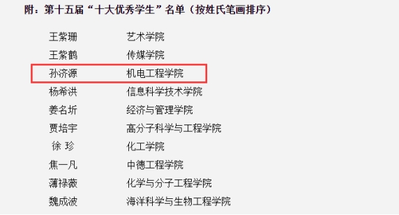 根据《青岛科技大学本专科学生荣誉奖奖励办法》(青科大字﹝2018﹞170号)和《关于评选青岛科技大学第十五届“十大优秀学生”的通知》(青科大学字〔2021〕9号)要求,结合学校实际,按照公开、公正、择优的原则,经学院(校区)推荐、资格审核、网络投票、现场汇报、民主投票等环节,现评选公示中,新莆京官网孙济源同学获得“十大优秀学生”。