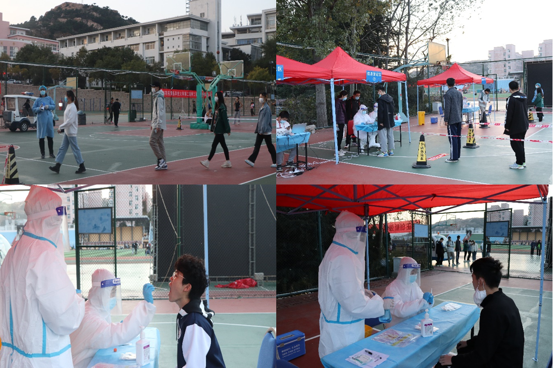 演练现场总指挥由学校疫情防控领导小组应急处置专班负责人范而军担任。演练模拟青岛市出现本土疫情,要求学校立即进行全员核酸检测。接到全员核酸检测紧急通知后,学校相关专班负责人2小时内迅速到位,并完成场地设置、帐篷搭建、电力保障、网络调试、警戒设置、人员组织等工作。学院约400名师生有序来到待检区域等候检测,在工作人员的引导下每10人一组,依次进行人员信息采集和咽拭子采样。采样结束后规范进行标本封存、交接、转运、医疗废物处置、环境消杀等工作。